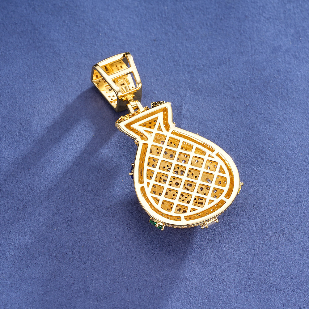 Presencia, brillo y estilo en una sola pieza. Nuestro Pendant Bolsa de Dinero está completamente cubierto con piedras de alto brillo A5 colocadas a mano, creando un efecto iced-out que destaca desde cualquier ángulo.